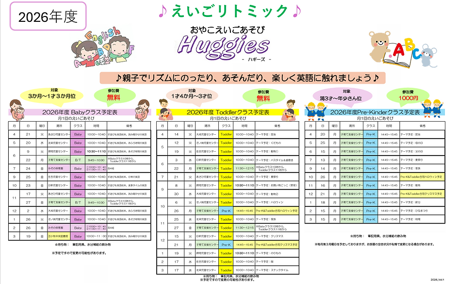 ※BabyクラスとToddlerクラスにつきましては直接児童センター様や子育て支援センター様にお問い合わせくださいませ。